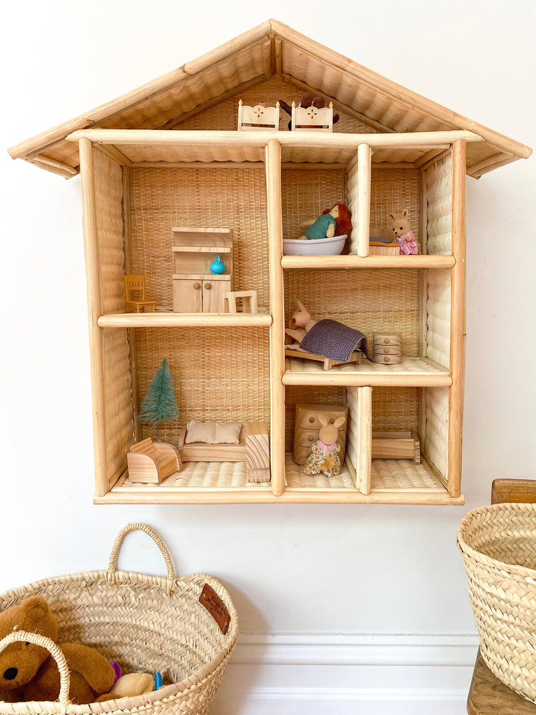 Our own Pretty Snippets design, handmade in rattan, the shelf house can hang on a wall at child's height or on the floor for imaginative play. It can also be used as a shadow box to display dolls, animals and other treasures.